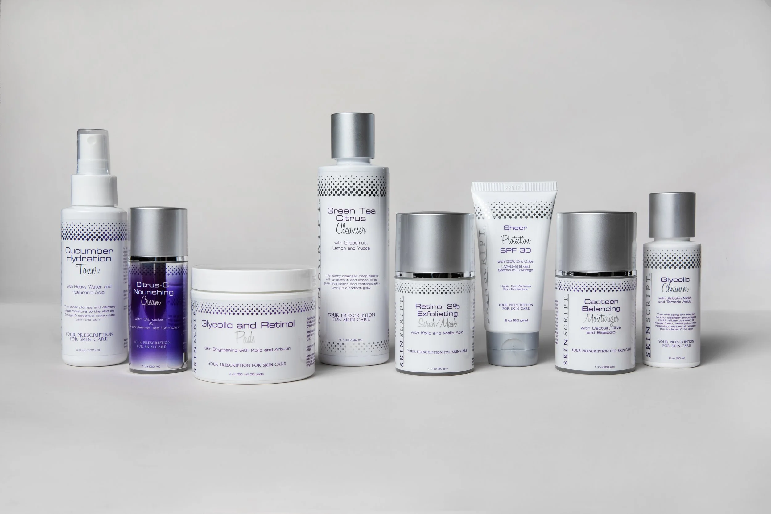 Categories: Select a Category Cleansers Exfoliants Toners Serums Moisturizers Skin Script BareRose Wax Skin ScriptRX Raspberry Refining Cleanser from $13.00 Skin ScriptRX Glycolic Cleanser from $14.00 Skin ScriptRX Honey Brightening Cleanser from $14.00 Skin ScriptRX Charcoal Clay Cleanser from $12.50 Skin ScriptRX Green Tea Citrus Cleanser from $12.50 Skin ScriptRX Pomegranate Antioxidant Cleanser from $12.50 Skin ScriptRX Clarifying Toner Pads $22.00 Skin ScriptRX Glycolic and Retinol Pads $30.00 Skin ScriptRX Raspberry Refining Scrub $33.00 Skin ScriptRX Revitalizing Cucumber Treatment $52.00 Skin ScriptRX Mint Refining Toner from $15.00 Skin ScriptRX Cucumber Hydration Toner from $15.00 Skin ScriptRX Citrus C Nourishing Cream $48.00 Skin ScriptRX Vitamin C Green Tea Serum (1oz) $44.00 Skin ScriptRX Ageless Skin Hydrating Serum $40.00 Skin ScriptRX Advanced Renewal Serum $66.00 Skin ScriptRX Mandelic Brightening Serum $40.00 Skin ScriptRX Peptide Eye Serum $36.00 Skin ScriptRX Tri-Peptide Eye Cream $36.00 Skin ScriptRX Blemish Spot Treatment $23.00 Skin ScriptRX Botanical Bloom Hydrating Mask $48.00 Skin ScriptRX Light Aloe Moisturizer $22.00 Skin ScriptRX Ageless Skin Moisturizer $24.00 Skin ScriptRX Cacteen Balancing Moisturizer $31.00 Skin ScriptRX Açaí Berry Moisturizer $37.00 Skin ScriptRX Peptide Restoration Moisturizer $55.00 Skin ScriptRX Hydrating Moisturizer $32.00 Skin Script Sheer Protection SPF 30 $30.00 Skin Script Ageless Lip Treatment $16.00 Skin Script Minimalist Kit $47.00 Skin Script Hyperpigmentation/Pre Post Peel Care Kit $241.00 Skin ScriptRX Acne Skin Kit $117.00 Skin ScriptRX Oily Skin Kit $163.00 Skin ScriptRX Normal/Combination Skin Kit $230.00 Skin ScriptRX Dry/Sensitive Skin Kit $245.00 Retinol 2% Exfoliating Scrub/Mask $45.00